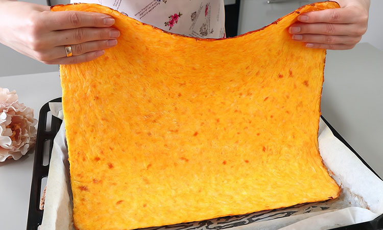 Когда сырный слой будет готов, дайте ему немного остыть до теплого состояния и аккуратно отделите от пергамента. Переверните пласт и распределите мясную начинку ровным слоем, оставляя свободный край в один сантиметр для качественного шва. Сверните плотный рулет, подбивая начинку с боков. Переложите изделие на листы фольги, сложенные внахлест, и плотно заверните.