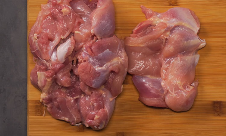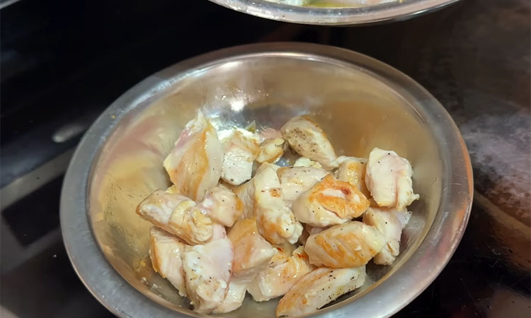 Нарежьте куриную грудку некрупными кусочками, стараясь делать их одинаковыми для равномерного распределения в тарелке. Разогрейте на сковороде или в кастрюле с толстым дном оливковое масло и быстро обжарьте мясо до появления легкого цвета. Посолите и поперчите курицу в процессе обжарки, после чего сразу снимите ее с огня и переложите в отдельную емкость. Возьмите белую часть лука порея, разрежьте ее вдоль и тщательно промойте под струей воды каждый лист.