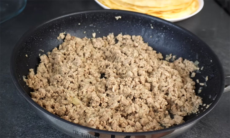 Следите за тем, чтобы мясо оставалось сочным и не начинало поджариваться, после чего дайте начинке полностью остыть. Для теста смешайте в миске молоко с яйцами, сахаром и солью, слегка взбивая смесь венчиком. Осторожно влейте крутой кипяток в молочную массу, постоянно помешивая.