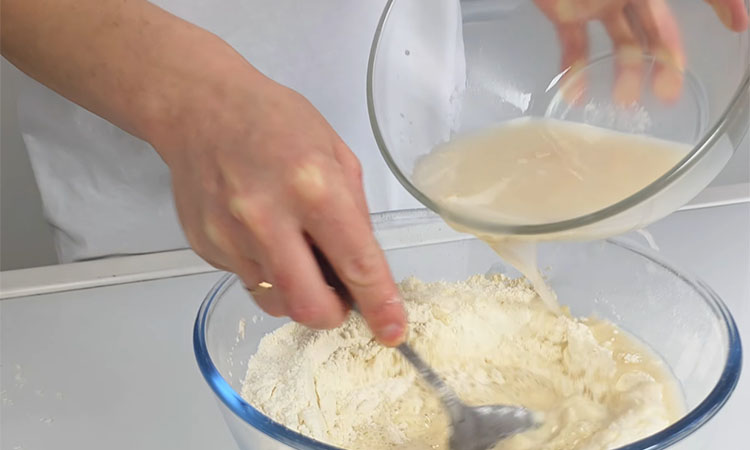 Возьмите небольшую миску, насыпьте туда сахар, раскрошите живые дрожжи и немного перетрите их ложкой. Влейте теплую воду, хорошо размешайте до полного растворения всех частиц и оставьте смесь в стороне на пару минут. В отдельную глубокую чашу просейте муку и сразу всыпьте в нее соль. Теперь влейте подготовленную воду с дрожжами в муку и начинайте перемешивать массу обычной столовой ложкой. Добиваться гладкости на этом этапе не нужно, пусть тесто остается липким, рыхлым и неоднородным.