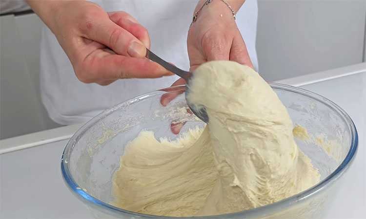 Добавьте оливковое масло и еще раз вмешайте его ложкой, пока жир полностью не соединится с мучной основой. Накройте чашу полотенцем и дайте тесту отдохнуть при комнатной температуре ровно 20 минут. Снимите полотенце и сделайте легкую протяжку: подцепите край массы лопаткой, потяните его вверх и аккуратно уложите на середину. Повторите такое движение четыре раза, поворачивая миску по кругу, чтобы тесто стало более эластичным.