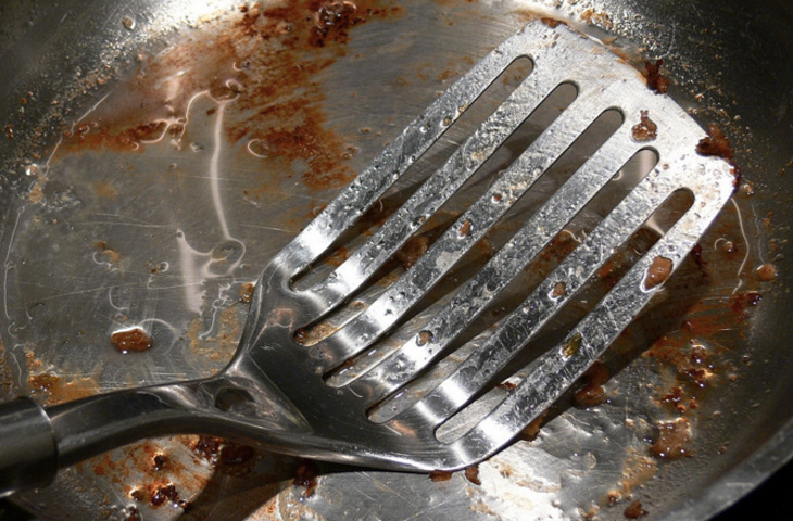 Колебания температуры для посуды из нержавеющей стали весьма губительны. Перед тем как положить грязную посуду в раковину и залить ее холодной водой, дайте ей остыть. Замачивание горячей сковороды может привести к непоправимым повреждениям кухонной утвари.