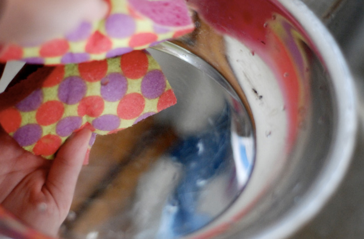 Если посуду из нержавеющей стали не просушить должным образом, то на ней появятся пятна от воды, вызванные минералами, входящими в ее состав. Чтобы этого не произошло, сразу же после мытья посуду следует насухо протирать полотенцем. При появлении подобных пятен смочите губку водой и обмокните ее в небольшое количество разрыхлителя, после чего вымойте посуду как обычно и насухо вытрите.
