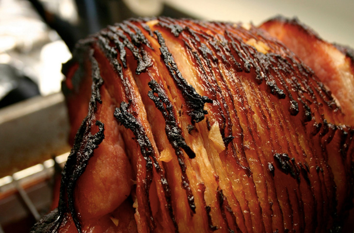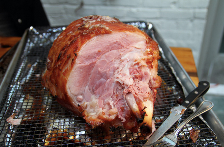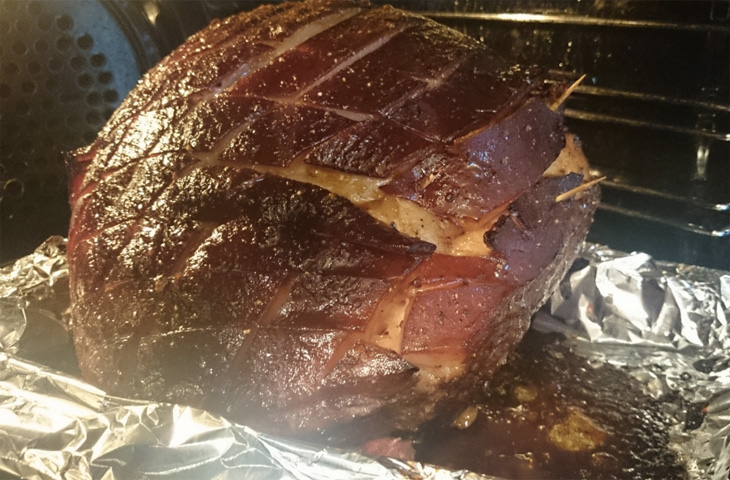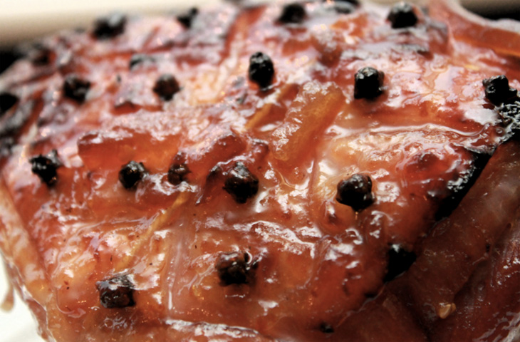 Полить половиной глазури окорок, накрыть фольгой. Выпекать около 1 часа 30 минут, часто поливая, пока термометр, вставленный в самую толстую часть не покажет 52 °C. Снять фольгу, смазать мясо оставшейся глазурью. Выпекать еще около 30 минут, пока верх слегка не карамелизуется. Переложить окорок на блюдо. Удалить гвоздику. Перелить сок от мяса в миску и подавать вместе с окороком.