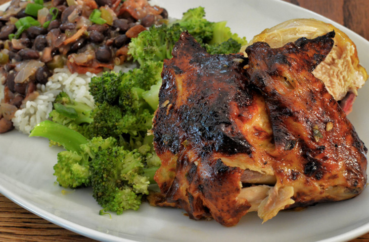 В ступке растолочь ямайский душистый перец. Добавить все в блендер и смешать до однородной массы. В застегивающийся пакет выложить курицу и какое-то количество соуса, чтобы он полностью покрывал птицу. Убрать в холодильник по крайней мере на 4 часа, а лучше на ночь. Оставшийся соус накрыть и также убрать в холодильник.