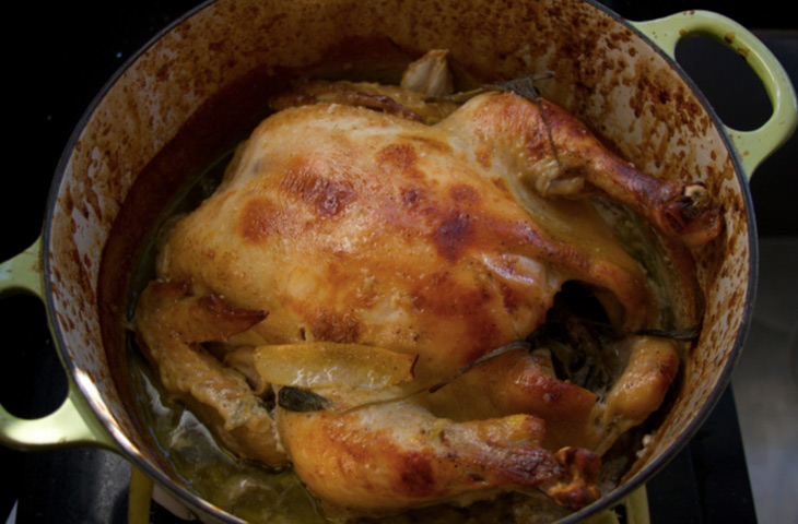 Разогреть духовку до 190 °C. Щедро приправить курицу солью и перцем и обжарить в сливочном или оливковом масле до золотистого цвета. Снять с огня, положить курицу на тарелку, масло из кастрюли слить. Положить курицу обратно в кастрюлю с остальными ингредиентами. Готовить курицу, частично или полностью прикрыв кастрюлю крышкой, в предварительно разогретой духовке в течение 1,5 часов, периодически поливая птицу.