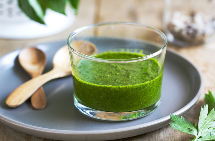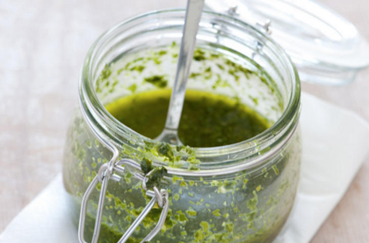 В блендере смешать листья с маслом в течение 2-х минут. Налить масло в банку и дать постоять в течение 1 часа, затем процедить, нажимая на зелень, приправить солью.