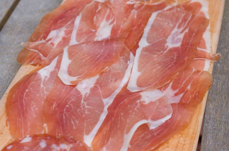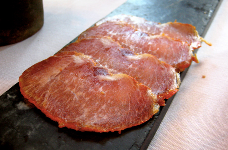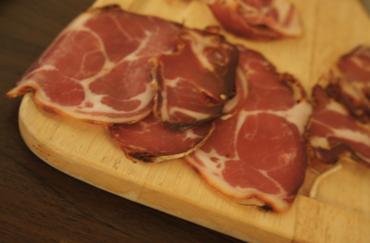 Этот мясной деликатес иногда называют «прошутто бедняка». Изготавливается он из шейной части свиной туши. Мясо натирают различными специями, как, например, корица, гвоздика, мускатный орех, соль и перец и оставляют примерно на неделю, после чего сушат в специальных камерах. Я предпочитаю нарезать его очень тонкими ломтиками и дополнять мостардой — фруктовой горчицей. Хотя и с панини или сэндвичами эта вяленая свинина прекрасно сочетается.