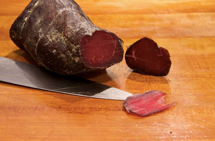 Это один из немногих мясных деликатесов, который делают из говядины. Постный кусок мяса солят, а затем сушат в камерах на протяжении 1-2 месяцев. В результате мясо приобретает темно-красный, насыщенный цвет. Мне нравится нарезать брезаолу очень тонкими ломтиками и немного сбрызгивать оливковым маслом и лимонным соком. В Италии брезаолу часто подают с нарезанными артишоками как антипасто или с сыром Робиола.