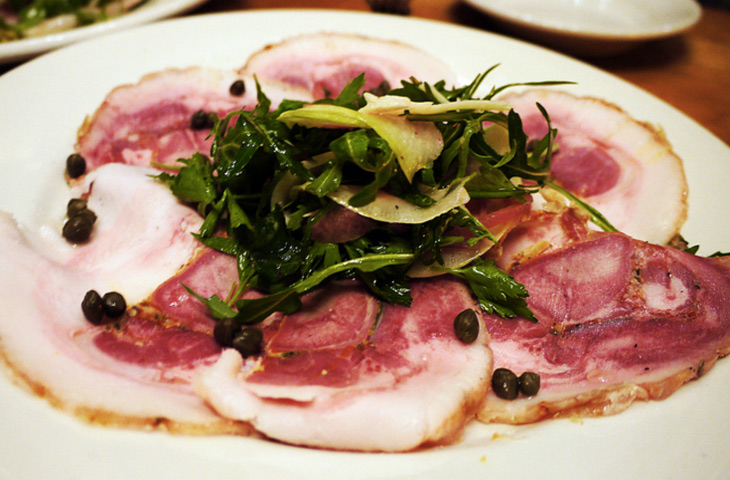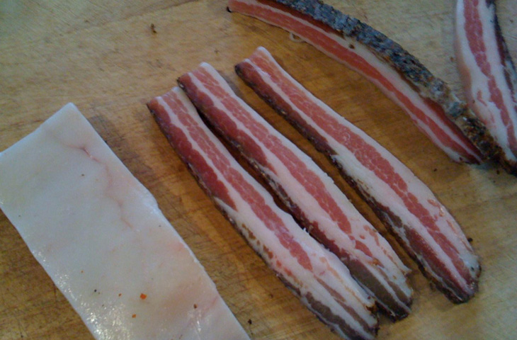 Итальянская версия бекона делается из живота свиньи. В общих чертах процесс изготовления панчетты выглядит так: мясо натирают разнообразными травами, засыпают солью, а потом сворачивают в рулеты, связывают и оставляют сушиться на несколько месяцев. Панчетта часто используется как ингредиент многих итальянских блюд. К примеру, настоящую пасту Карбонара делают как раз таки с панчеттой.
