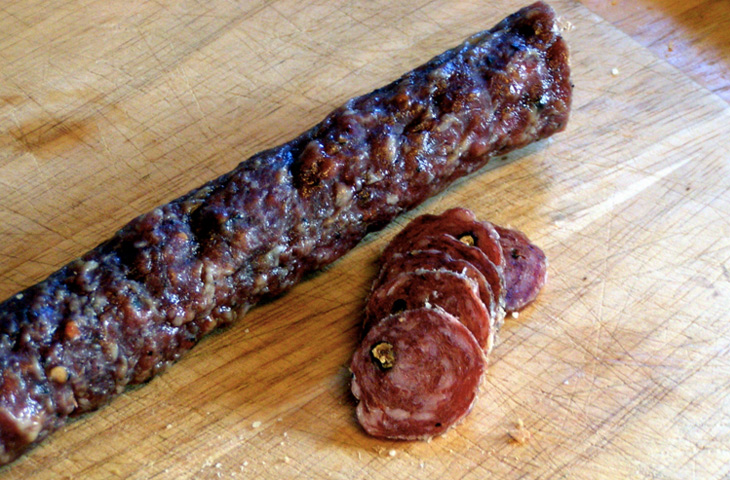 Это наиболее популярная разновидность копченой колбасы. На срезе она имеет рисунок мрамора. Традиционно салями делают из свинины с добавлением специй, придающих мясу особый вкус и аромат. Типичными добавками являются перец, чеснок и красное вино. Что касается меня, то я отдаю предпочтение пикантному виду салями, с красным или кайенским перцем.