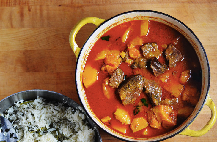 Обжарить перец чили на сковороде и залить кипятком. Дать размягчиться и очистить от семян и стебля. В блендере измельчить перец до консистенции пюре. В большой кастрюле с толстым дном разогреть масло, обжарить лук и чеснок. Туда же выложить куски говядины и жарить приблизительно 5 минут. Выложить говядину на тарелку.