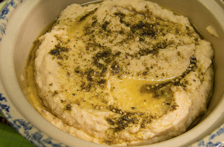 В средней миске смешать хумус с маслом, лимонным соком, водой, затар и сахаром. Приправить солью и перцем и подавать.