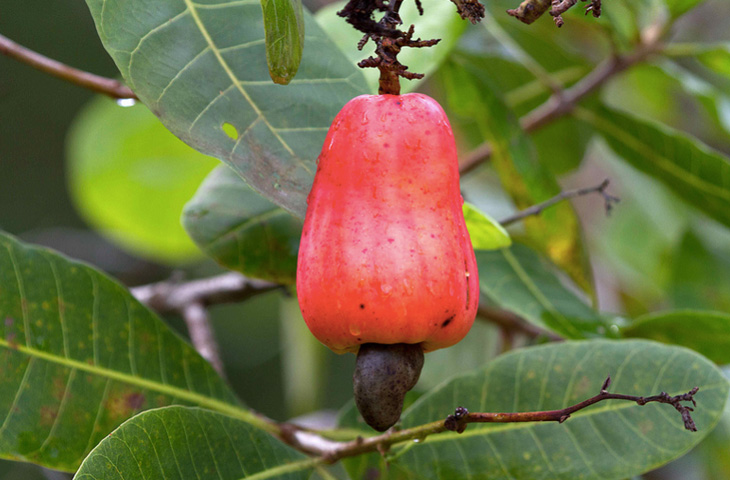 Еще один псевдоорех принадлежит к роду Сумаховых. Плодоножка дерева разрастается в виде груши, состоящей из двух частей: яблока кешью, так принято называть этот плод, и прикрепленного к нему семени – кешью. Между оболочкой и скорлупой кешью содержится едкой вещество кардол, вызывающие ожоги на коже, поэтому перед продажей все «лишнее» удаляют, оставляя только съедобное ядро.