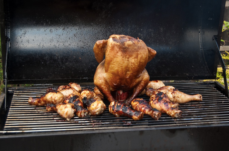 В сковороде на среднем огне обжарить кориандр, кумин, перец горошком, кардамон, чили, душистый перец, гвоздику, пока семена не начнут лопаться, 1-2 минуты; дать им остыть. Переложить в мельницу для специй вместе с шиповником, измельчить и выложить в миску. Добавить карри, корицу, сумах, имбирь, мускатный орех, пажитник, чеснок, соль и перец. Выложить курицу и обвалять в специях. Накрыть крышкой и убрать в холодильник на ночь. Перед жаркой маринад не смывать.