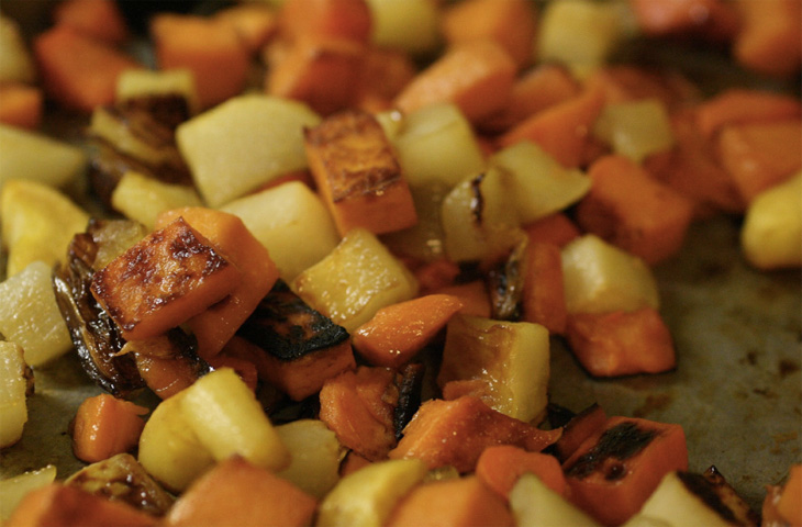 Нагреть духовку до 190 °C. Выложить овощи на чугунную сковороду или большую форму для выпечки. Запекать в течение 45 минут, перемешав один раз в середине приготовления.