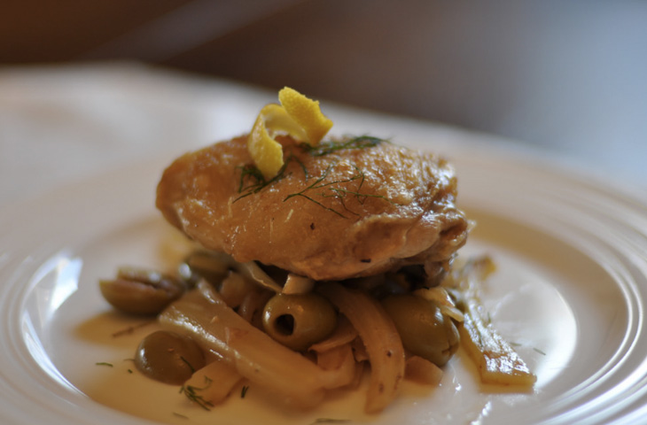 В большой сковороде с высокими бортами разогреть сливочное и оливковое масло на среднем огне. С обеих сторон приправить кусочки курицы солью и перцем, затем положить их в сковороду, кожей вниз. Жарить до золотистого цвета, около 5-7 минут. Перевернуть курицу и жарить еще 2-3 минуты с другой стороны. Переложить курицу на блюдо.