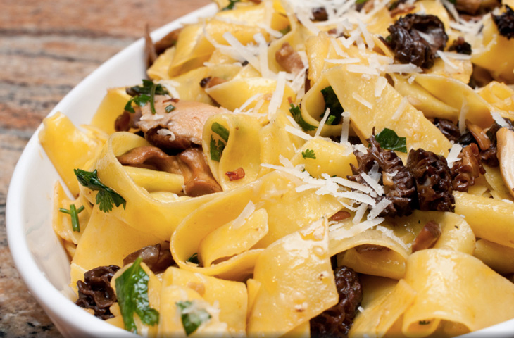 В большой кастрюле с кипящей подсоленной водой приготовить пасту, уменьшив время приготовления, указанное на упаковке, примерно на 3 минуты. Щипцами переложить пасту к грибам и добавить 240 мл. воды, в которой варилась паста. Увеличить температуру до средней, довести жидкость до кипения и готовить, подбрасывая пасту, до ее готовности и пока жидкость слегка не загустеет, около 2 минут. Добавить сливки, снова довести до кипения и готовить около 1 минуты. Снять с огня, добавить сливочное масло и перемешать. По вкусу отрегулировать приправы, если это необходимо. Перед подачей посыпать пасту сыром и зеленью.