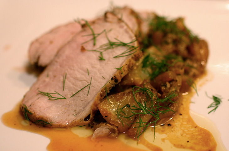 Разогреть духовку до 150 °C. Измельчить чеснок с семенами фенхеля, лимонной цедрой, красными перцем, солью и черным перцем. Натереть со всех сторон смесью приправ мясо. Положить мясо в небольшую форму для выпечки, добавить около 120 мл. воды и запекать в течение 4-5 часов, ничем не закрывая свинину, пока мясо не станет очень нежным. Периодически проверять мясо в процессе запекания и добавлять воду, если дно формы будет сухим.