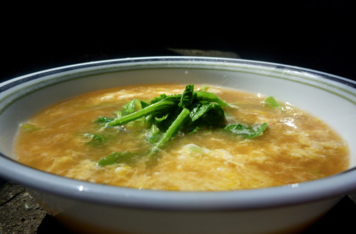 Жители Поднебесной подают яйца вместе с супом, и не по отдельности, а в виде полноценного блюда. В кипящий куриный бульон они выливают взбитые яйца. Под воздействием высокой температуры белок сворачивается, образуя небольшие хлопья, которые плавают в бульоне.