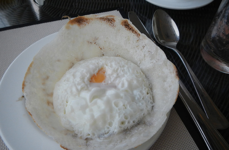 Типичный шри-ланкийский завтрак — это яйцо, приготовленное на блинчике из рисовой муки и кокосового молока. Выглядит блюдо как корзинка с яйцом. Чтобы получить такую форму блина, для жарки используется специальная сковорода. Жидкое тесто распределяют по ее стенкам и разбивают в нее яйцо. Потом сковороду закрывают и готовят, пока яйцо не затвердеет.