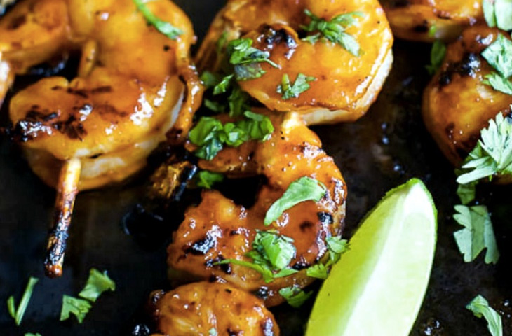 Нанизать креветки на шампуры. Используя масло в спрее, сбрызнуть им решетки гриля. Положить креветки на гриль. Жарить в течение 3-4 минут. Перевернуть и жарить еще 4-5 минут. Аккуратно смазать креветки с обеих сторон соусом. Жарить еще по минуте с каждой стороны. Снять креветки с гриля и еще раз смазать соусом. Перед подачей посыпать кинзой, подавать с дольками лайма.