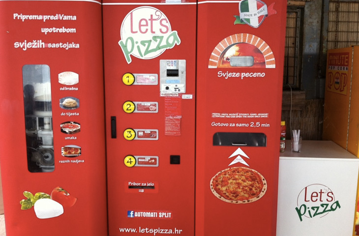 Оказывается испечь пиццу по силам не только опытному пиццайоло. С этой задачей легко может справиться и вендинг-машина. Торговый автомат предлагает на выбор несколько классических видов пиццы вроде «маргариты» и «пепперони». Из холодильника пиццы диаметром 23 сантиметра попадают в печь, а оттуда запакованные в картонную коробку — прямиком к вам в руки.