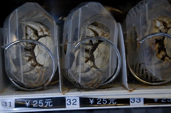 Жителям Китая такой деликатес, как живые крабы, доступен круглые сутки. Приобрести их можно прямо в вендинг-автомате всего лишь за каких-то 1,5 доллара. Наряду с крабами в таких автоматах также часто продают крабовый соус и имбирный чай.