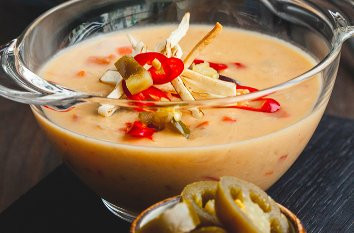 7. Добавить курицу, посолить, положить фасоль и сыр чеддер. Варить до растворения сыра. В самом конце добавить перец халапеньо.