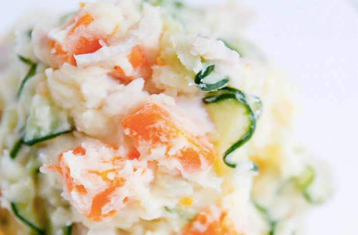 Когда картофель будет готов, слить воду и выложить горячий картофель в смесь с майонезом, перемешать деревянной ложкой, слегка пюрируя картофель. Руками отжать столько жидкости из лука и огурцов, сколько возможно. Выложить огурцы, лук и ветчину в картофельную смесь и перемешать. По вкусу отрегулировать соль и перец.