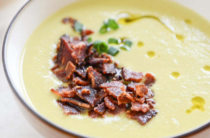 Сливочный суп с беконом и карамелизованным лукомИнгредиенты: