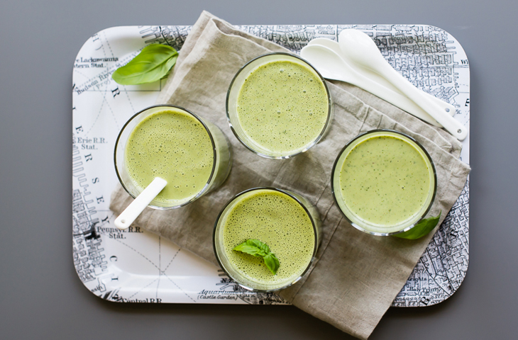 Свежие листья базилика, для украшения;Поместите песто, кефир и огурец в блендер. Перелейте в герметичный контейнер и охладите в холодильнике. Разлейте в баночки и украсьте базиликом.