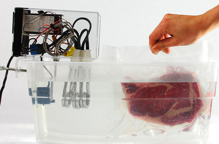 В переводе с французского sous-vide переводится как «в вакууме», что довольно точно отражает суть этого метода. В теории методика проста и понятна: продукт упаковывается в вакуумный пакет, после чего готовится в воде, температура которой колеблется в диапазоне 50-70 градусов Цельсия. Сам процесс готовки может занимать очень и очень продолжительное время — это зависит от продукта и режима приготовления. Но, в целом, цикл готовки будет гораздо продолжительнее привычных методов жарки или варки. Для готовки используется специальная техника — сувид-машина, которую русскоязычные локализаторы уже окрестили медленноваркой.
