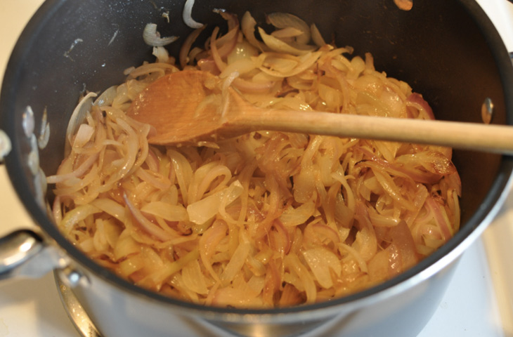 В большой жаровне или кастрюле растопить на среднем огне 3 столовые ложки масла. Добавить оливковое масло и лук. Готовить лук до размягчения, время от времени помешивая, около 15 минут. Добавить соль, перец и сахар. Убавить огонь и продолжать томить, периодически помешивая, пока лук не станет глубокого золотисто-коричневого цвета и не карамелизуется, еще 35-45 минут. Влить вино, увеличить огонь. Готовить, пока почти вся жидкость не выпарится, от 8 до 10 минут.