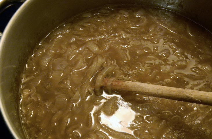 В некоторых рецептах на карамелизацию выделяют всего за 15 минут, в других, напротив, лук томят несколько часов. Если приготовлению уделить недостаточно времени — лук не раскроет свой аромат, а если его передержать на плите — вкусовые свойства будут уже не те. Оказалось, что в этом вопросе все-таки есть золотая середина: примерно за час лук приобретает ровный, глубокий золотисто-коричневый цвет и тот самый карамельный вкус. Лука в этом супе должно быть много. Это все же луковый суп, а не овощной бульон.