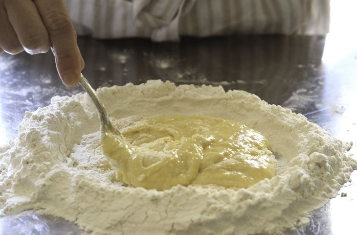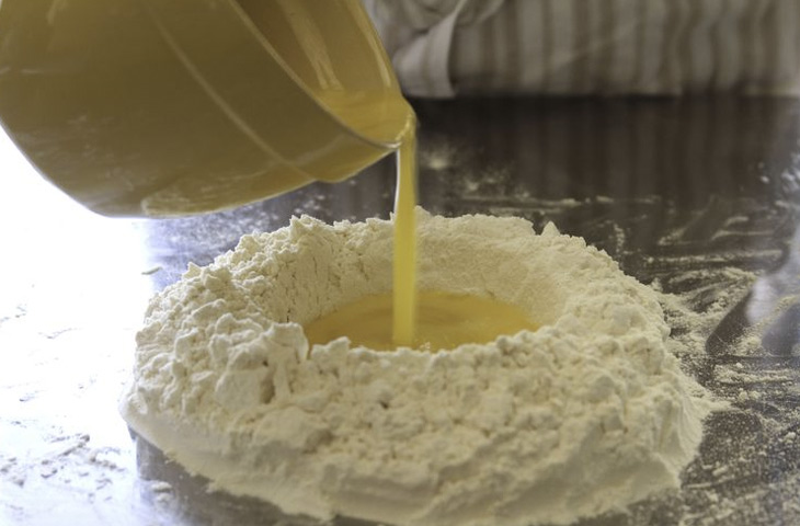 5 больших яицМуку необходимо выложить на рабочую поверхность и сделать в центре горки большое углубление, оставив фактически только стенки из муки. В небольшую миску разбить яйца, хорошо смешать вилкой. Смесь аккуратно вылить в углубление в центре муки.