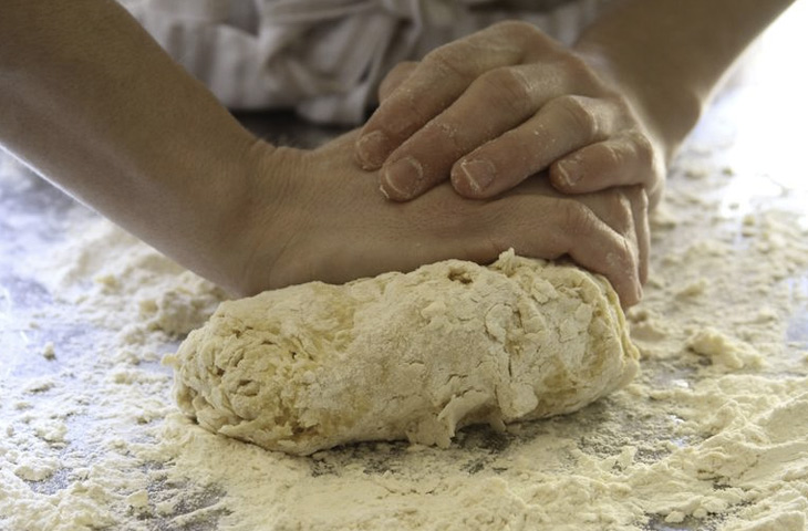 Месить тесто до упругой и гладкой консистенции. Готовое тесто обернуть пищевой пленкой и перед использованием дать отдохнуть в течение 30-40 минут при комнатной температуре. Тесто должно быть упругим и при надавливании быстро возвращать первоначальную форму.