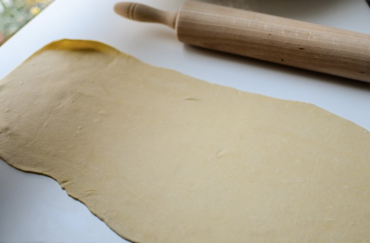 Если у вас нет машинки, придется воспользоваться старой доброй скалкой. Для получения тончайших слоев перед каждой раскаткой тесто следует складывать вдвое и снова раскатывать. Тесто необходимо раскатать как можно тоньше. Раскатанный пласт теста разместите на рабочей поверхности и нарежьте с помощью ножа на небольшие квадратики.