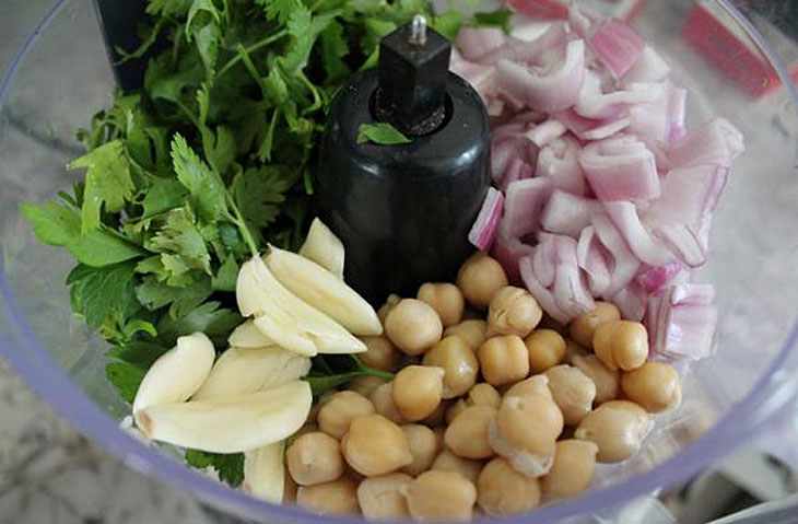 Лук, зелень,чеснок, кумин, кориандр и соль выложить в комбайн вместе с нутом и тщательно измельчить до состояния густого пюре. Не пугайтесь, если смесь пока не будет держать форму шаров — всему свое время.