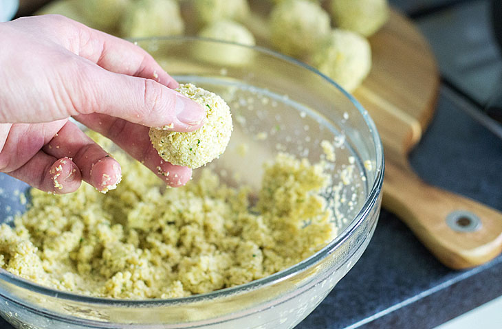 Переложите измельченный нут в миску и отправьте в холодильник минимум на 15 минут. За это время крахмал успеет напитать смесь и она станет более густой. Аккуратно слепите шары и разложите их на плоской тарелке.