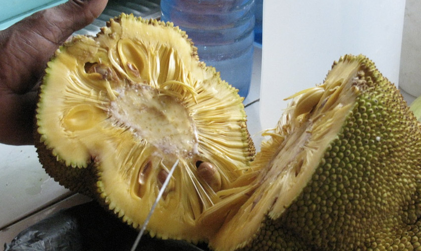 Плоды джекфрута могут весить до 34 кг. Толстая кожура и семена зрелого плода истончают весьма неприятный запах, в то время как мякоть пахнет приятно и чем-то напоминает ананас и банан. Фрукт широко распространен в Юго-Восточной Азии, Индии и Бангладеше. Чего с ним только ни делают местные кулинары: его жарят, варят, тушат, добавляют в десерты и просто едят в свежем виде.