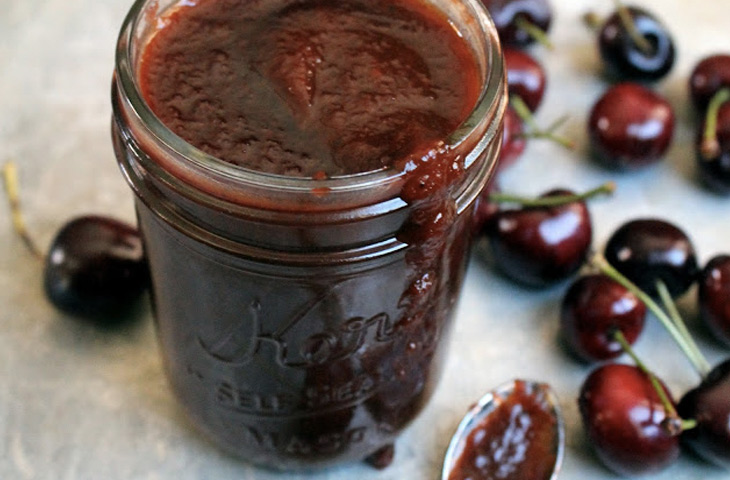 Нагреть оливковое масло в кастрюле на среднем огне. Добавить лук и обжарить в течение 5 минут. Выложить чеснок и обжарить еще 1-2 минуты. Добавить черешню, кетчуп, коричневый сахар, бальзамик, вустерширский соус, горчицу и черный перец. Довести до кипения, затем уменьшить огонь до средне-низкого и варить 10 минут.