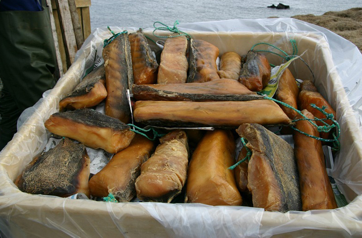 У берегов Исландии в сети рыбаков часто попадается гренландская полярная акула. В свежем виде, мясо этой акулы ядовито, из-за повышенного содержания в мясе мочевины и аммиака (у гренландской акулы нет почек и выделительной системы). Древние рыбаки придумали такой способ употреблять акулье мясо в пищу — исландцы отделяют акулье мясо от костей и складывают в бочки, после чего зарывают в землю на 6-8 недель. После, куски протухшей рыбы извлекают на свет, проветривают и вялят на воздухе еще около четырех месяцев. За это время гнилое мясо покрывается аппетитной корочкой. Те, кому удалось попробовать это кулинарное великолепие, утверждают, что блюдо в своей отвратительности превосходит все, на что способен человеческий гений.