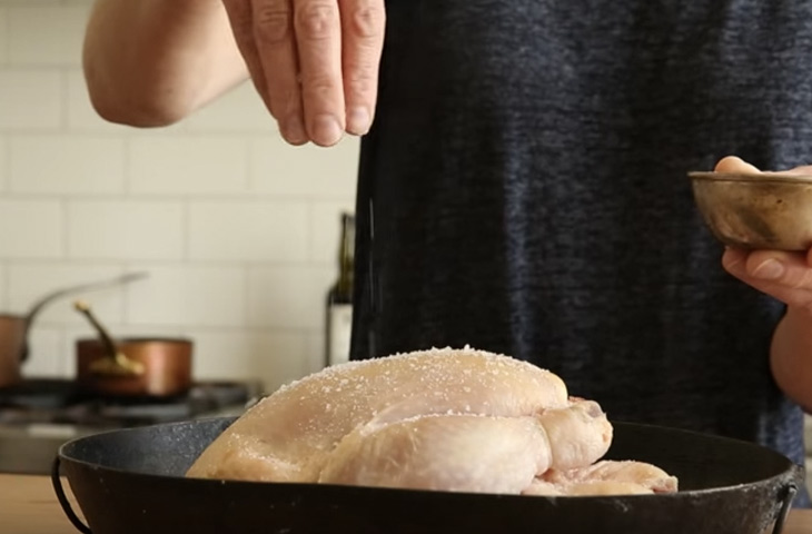 Положить курицу на решетку, установленную на застеленной фольгой форме для запекания, грудкой вверх и щедро посыпать солью (шеф-повар использует около 1 столовой ложки соли). Приправить тушку по вкусу свежемолотым перцем. Поставить птицу в разогретую духовку и запекать 50-60 минут, в зависимости от веса, до готовности. Достать курицу из духовки и положить на разделочную доску. Оставить отдыхать на 15 минут.