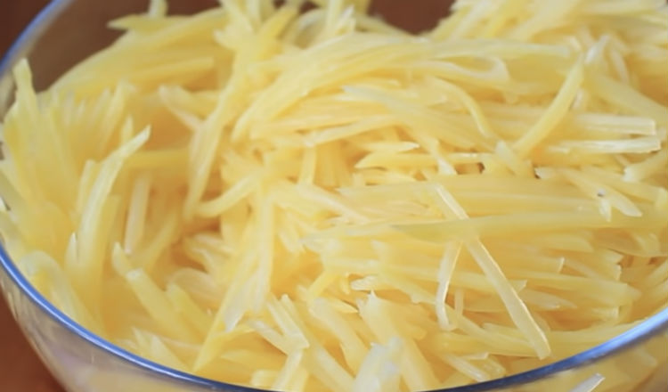 Картошка нарезается очень мелко. Удобнее делать это на терке, но в принципе можно обойтись и ножом. Нарезанные соломкой картофелины отправляются в кипящую воду минуты на три — внутри овощ должен остаться практически сырым.
