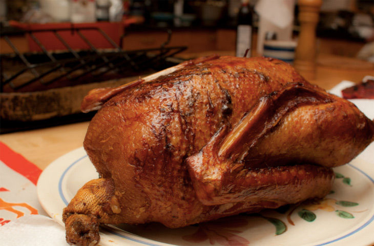 После приготовления процедить жир через сито в большую жаропрочную миску — его можно использовать для жарки картофеля и других овощей. Готовую птицу оставить отдыхать в течение по крайней мере 30 минут, покрыв свободно фольгой.