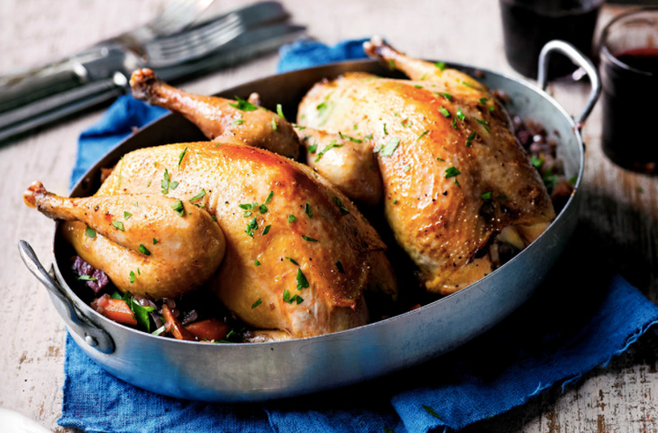 Переставить сковороду в духовку и запекать в течение 30 минут, перевернув птиц спустя половину расчетного времени приготовления. Для проверки готовности использовать термометр для мяса — температура грудки должна достигнуть 63 ºC для самцов и 60 ºC для самок (температура в области ног должна составлять 80-82 ºC). Готовых птиц переложить в теплое место, накрыть и оставить отдыхать.