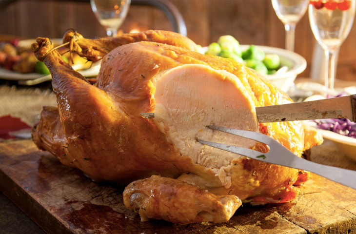 Поставить птицу в духовку и запекать в течение 1 часа. Затем поставить в духовку части птицы и продолжить выпекать в течение еще 30 минут. Выжать сок из 2 очищенных апельсинов. Увеличить температуры печи до 230 °C и добавить около трети апельсинового сока в каждый противень. Сбрызнуть растопленным сливочным маслом или оливковым целую птицу и ее части. Продолжать выпекать, пока термометр, вставленный в птицу, не зарегистрирует 74 °C: для целой птицы (сверх 1 часа) это может занять дополнительные 20-30 минут, для частей индейки — 15-40 минут. Доставать индейку по мере готовности кусков (грудка пропечется быстрее); если птица будет румяниться слишком быстро, прикрыть ее свободно фольгой.