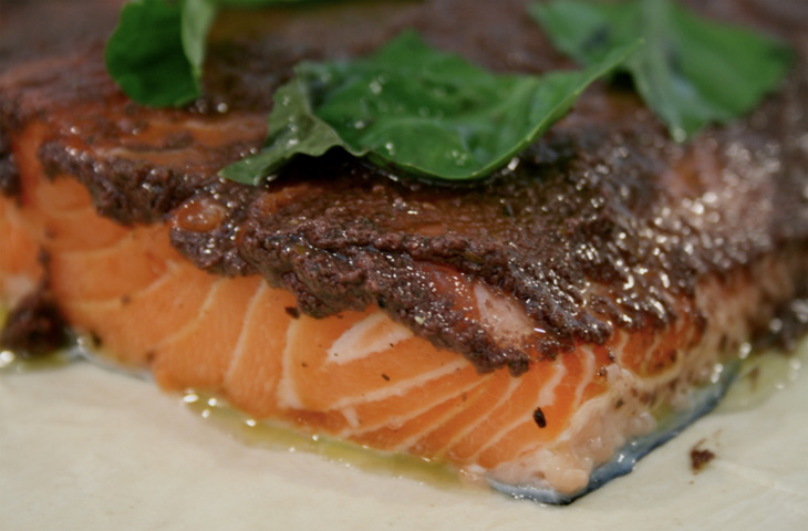 Разогреть верхний гриль, установить решетку в 15 см. от источника тепла. Очистить рыбу от маринада и положить кожей вниз на другой противень. Приправить рыбу солью и перцем. Жарить лосось под грилем в течение примерно 12 минут, пока термометр, вставленный в самую толстую часть филе, не зарегистрирует 51 °C. Дать рыбе отдохнуть 10 минут, а затем переложить ее на блюдо. Подавать с горчичным соусом или соусом на свой вкус.