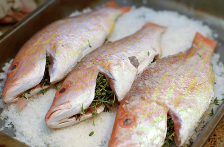 Выпекать рыбу в течение 25 минут, до тех пор, пока термометр, вставленный в подготовленное отверстие, не покажет 57 °C. Дать рыбе постоять в течение 10 минут. Расколоть соляную корку и выбросить ее. Кистью смахнуть лишнюю соль. Снять с рыбу кожу и разделить на кусочки. Переложить на блюдо, сбрызнуть оливковым маслом и подавать.